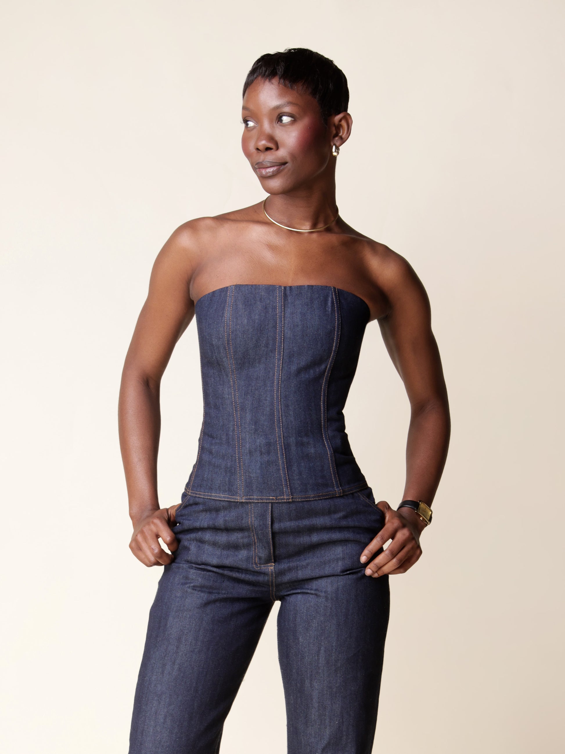 A "Big Jue" is a beautiful Liberian woman with a magnetic aura. This denim corset is the perfect way to channel that energy. It's cut to sculpt your body while leaving room to breathe. It has steel boning in all the panels for a secure fit. The crisscross strings in the back makes it adjustable for added comfort. Pair this corset with our matching "Big Jue" skirt for a monochromatic look or layer it under or over some of your favorite looks. This corset can go from summer parties to NYFW with the right styling and accessories!